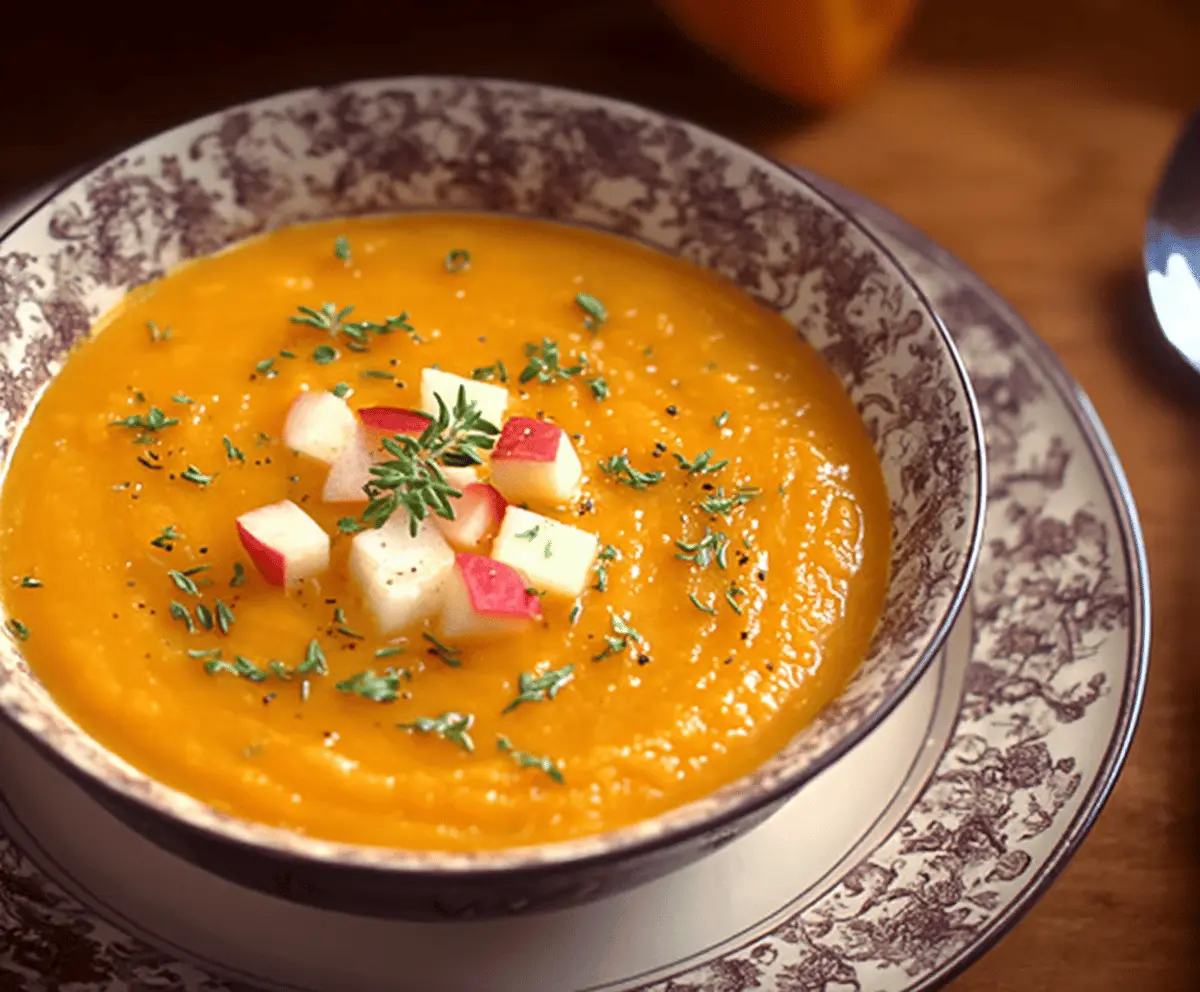 Ladle the warm soup into bowls. Top each with a dollop of cream (if you like), diced fresh apple pieces, fresh thyme sprigs, and a little sprinkle of smoked paprika or chili flakes if you want a touch of heat.