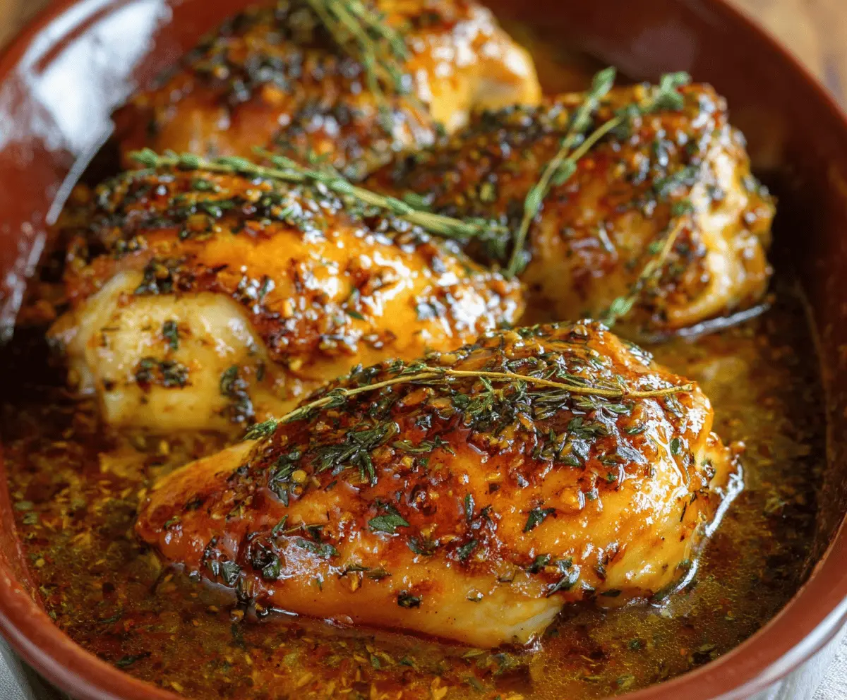 Scatter fresh rosemary sprigs over and around the chicken for extra aroma. Bake uncovered for 25-30 minutes, or until the chicken reaches an internal temperature of 165°F (74°C) and the top is caramelized and golden. Every 10 minutes, spoon some pan juices over the chicken for moist, flavorful meat.