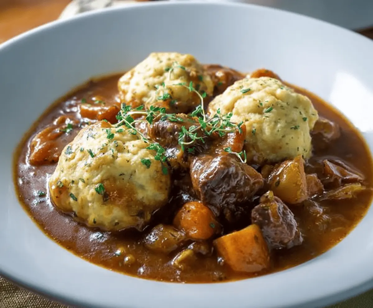 Beef Stew with Dumplings is a hearty and comforting dish that brings together tender chunks of beef, rich vegetables, and soft, fluffy dumplings all in one pot. The stew is thick and full of flavor, with the dumplings soaking up the savory broth to make every bite extra satisfying.