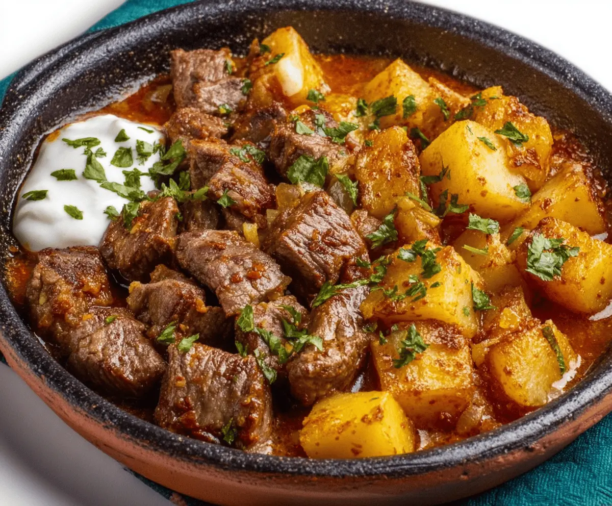 This dish takes about 15 minutes to prepare and about 2 hours of cooking time to get the beef tender and potatoes soft. It’s perfect for a weekend meal or a relaxed evening when you can let it simmer and develop rich flavors.