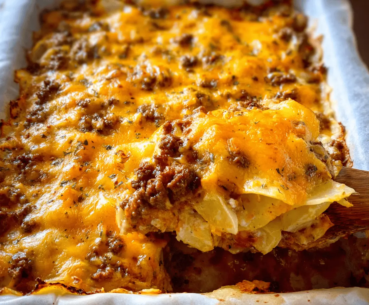 Cheesy Ground Beef And Potato Casserole is a comforting, hearty dish that combines tender ground beef, soft potatoes, and a generous layer of melted cheese. It’s the kind of meal that feels like a warm hug on a plate, perfect for family dinners or when you need something filling and satisfying.