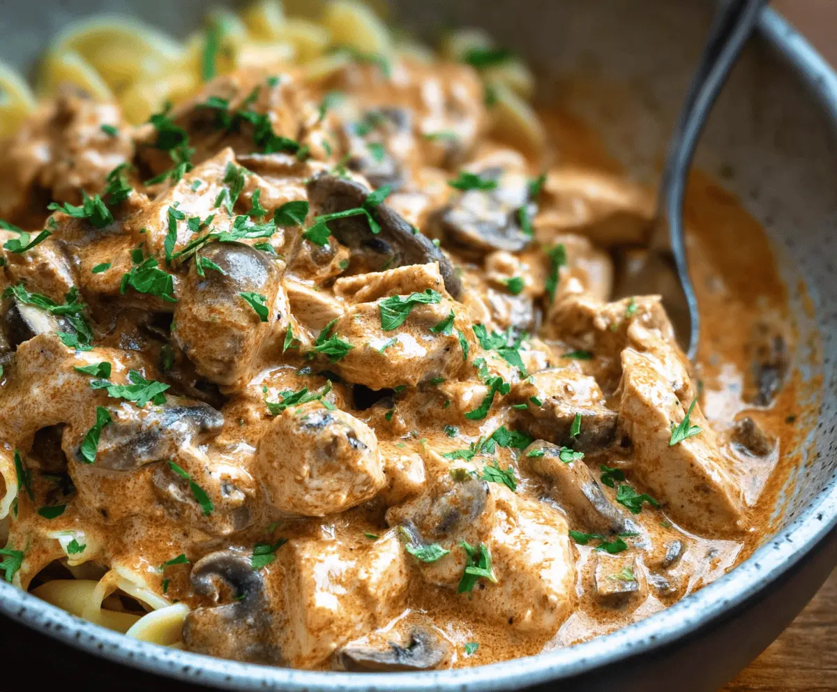 Place cooked egg noodles, rice, or mashed potatoes on plates or bowls. Spoon the creamy chicken stroganoff over the top. Sprinkle with fresh parsley for a pop of color and fresh flavor. Serve warm and enjoy your cozy, delicious meal!