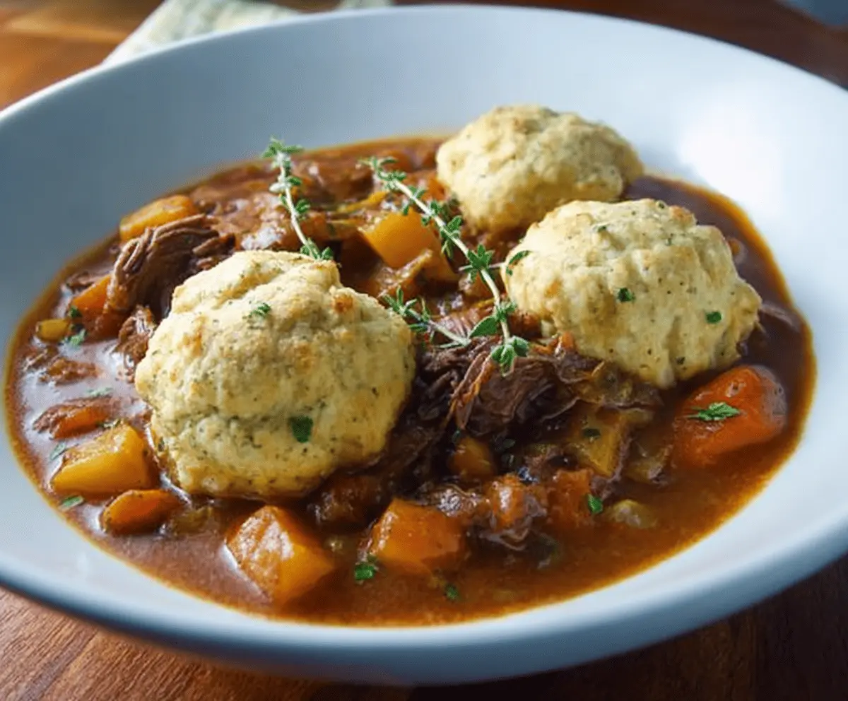 Delicious Beef Stew and Dumplings is a hearty, comforting dish that combines tender chunks of slow-cooked beef with soft, fluffy dumplings floating on top. The rich, savory stew is filled with vegetables like carrots and potatoes, making every spoonful full of warmth and flavor. It’s the kind of meal that feels like a big, cozy hug on a cold day.