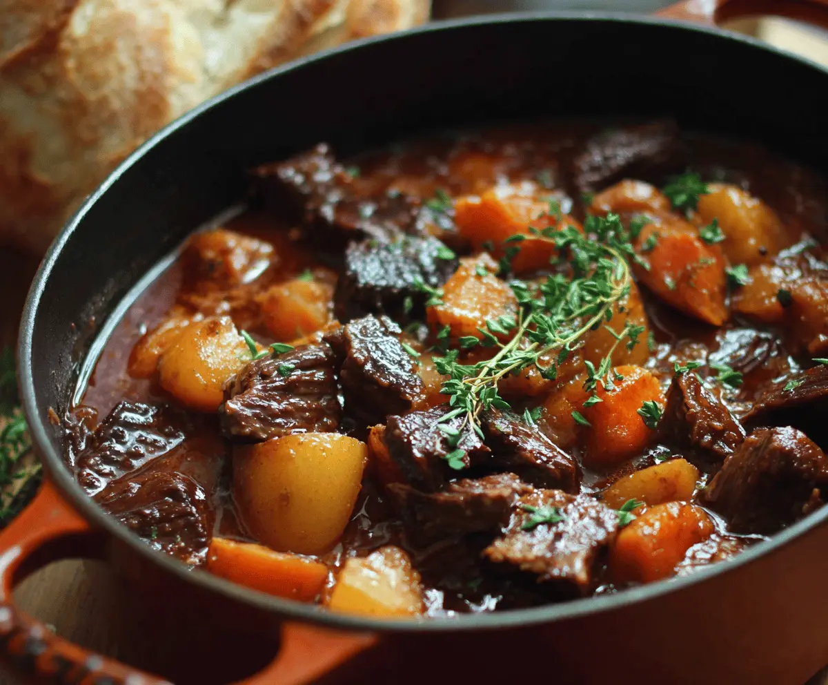 Remove bay leaf and thyme sprigs. Taste and adjust seasoning with salt and pepper. Serve the stew hot with crusty French bread on the side for dipping and enjoying every bit of that rich sauce.