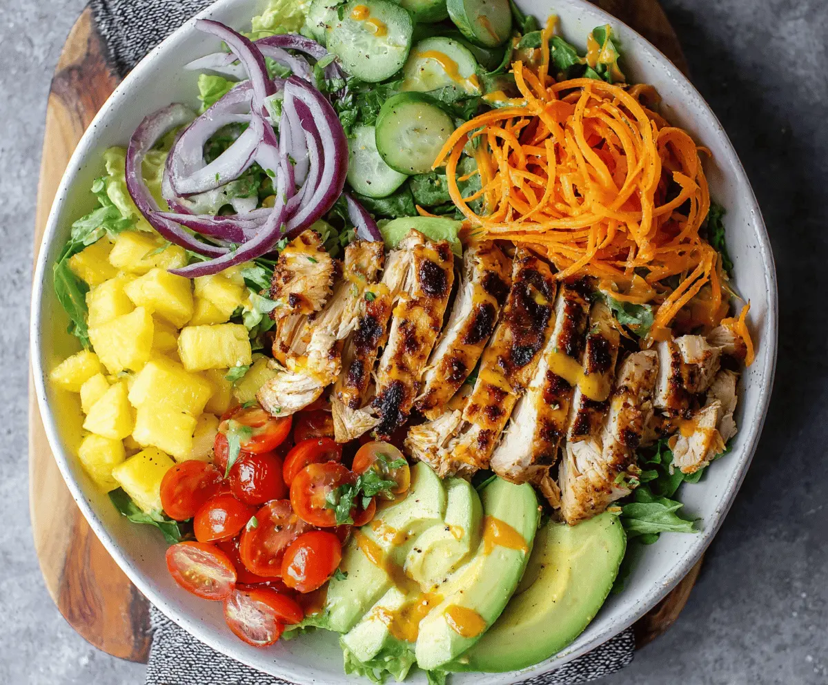 Start by spreading a bed of greens in your serving bowls or plates. Arrange the sliced chicken in the center. Around the chicken, place avocado slices, pineapple chunks, cherry tomatoes, shredded carrots, and red onion rings neatly. Drizzle dressing over the top and sprinkle with fresh chopped cilantro for a bright finish.