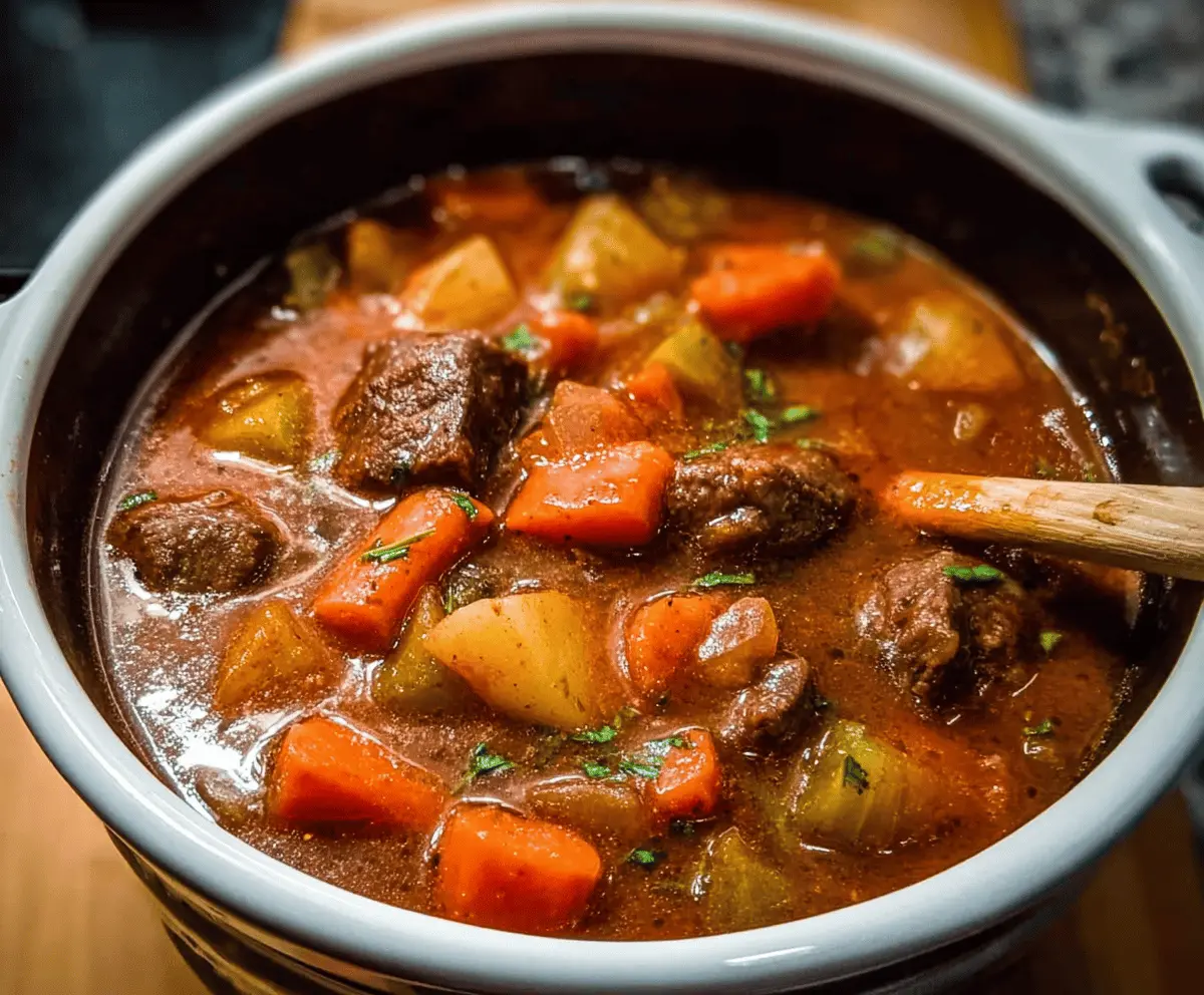 I always love making this stew because the smell that fills the kitchen while it’s cooking is unbeatable. There’s something so satisfying about letting everything bubble away until the beef is melt-in-your-mouth tender and the veggies are soft but not mushy. I usually make a big pot so there’s plenty for leftovers, which somehow taste even better the next day.