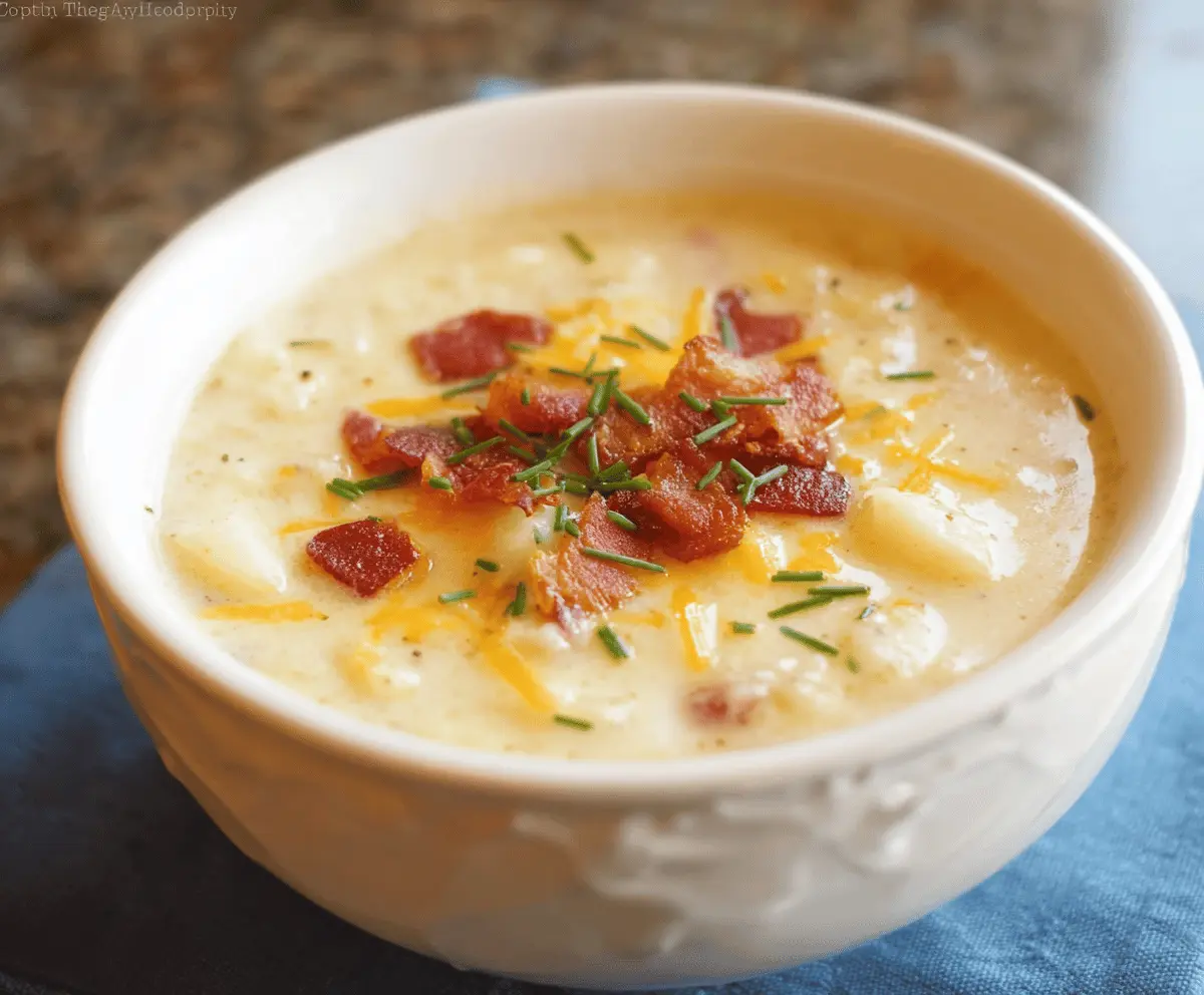 Taste the soup and add salt and black pepper as needed. Ladle the soup into bowls and garnish with crumbled bacon, extra shredded cheddar cheese, and chopped fresh chives. Serve warm with crusty bread or a side salad for a satisfying meal.